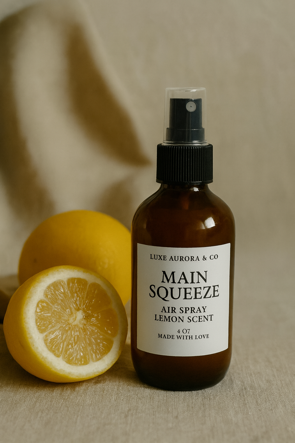 Meet your new obsession — Main Squeeze. Bursting with the crisp, refreshing aroma of lemon, this luxury air spray instantly brightens your mood and transforms your space with a clean, uplifting fragrance.